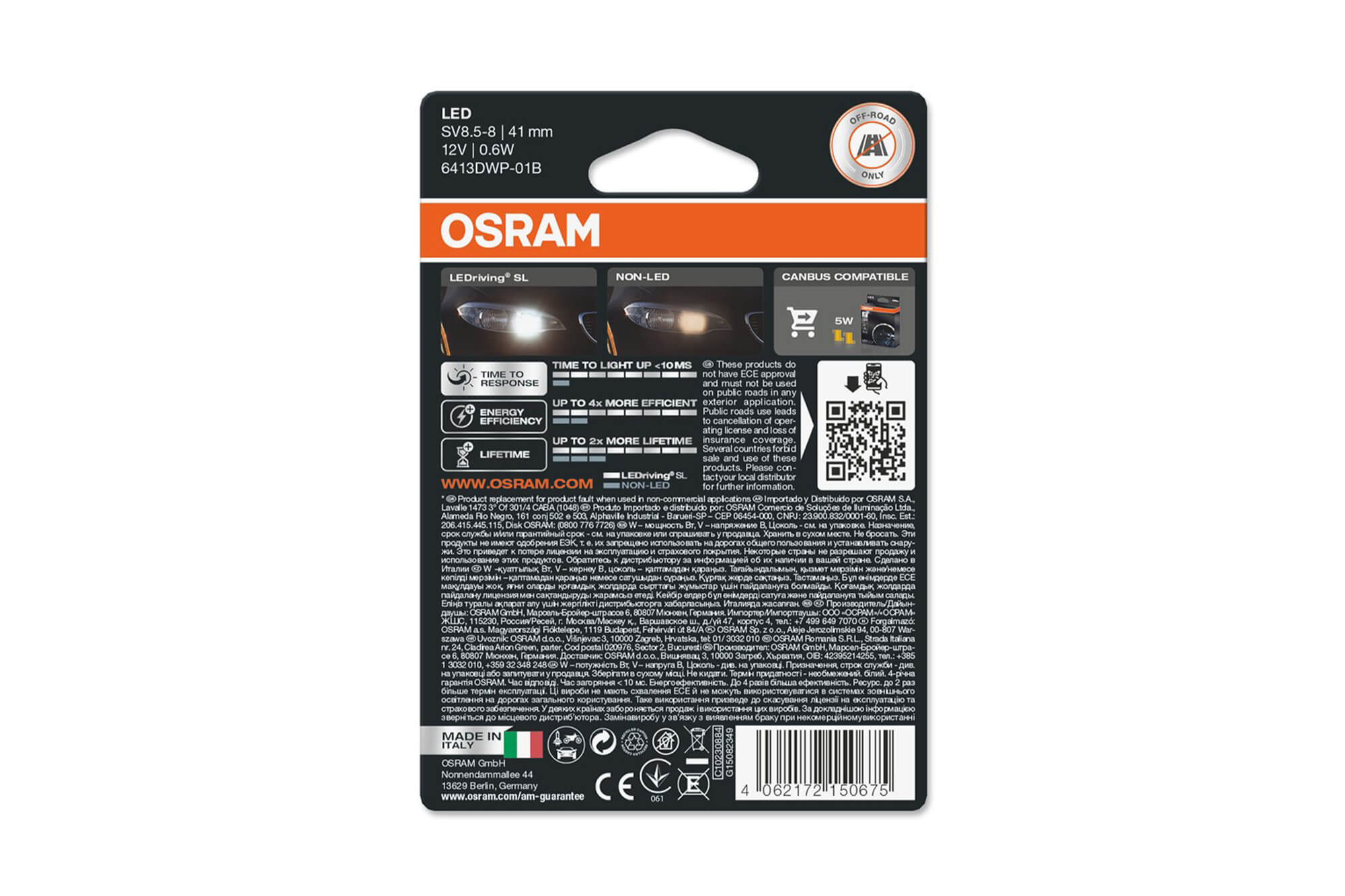 Opis za LED sijalice Osram tip C5W 41mm., hladno bela 6000K, 12V, 25LM, 0.60W, SV8.5-8, 1 komad